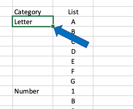Fill Down: Another method is to drag the word down. By clicking the box in the corner of the cell and dragging it down to where you the data to go.